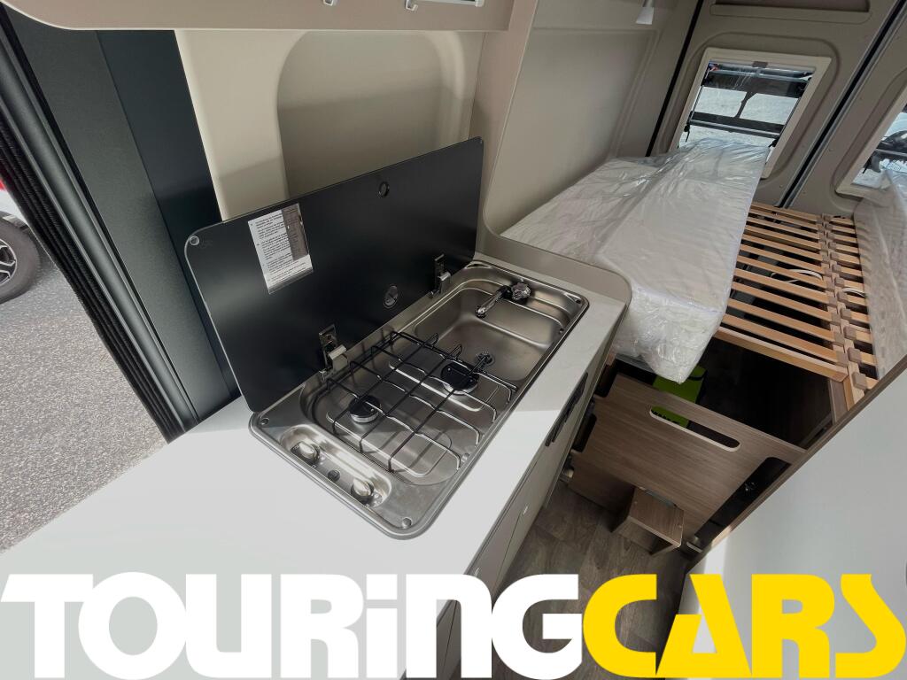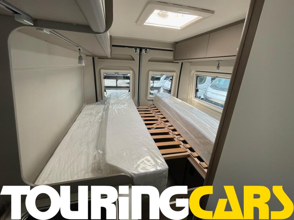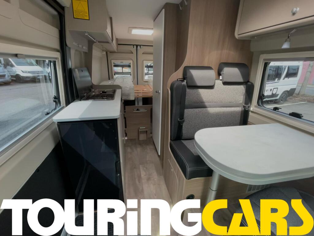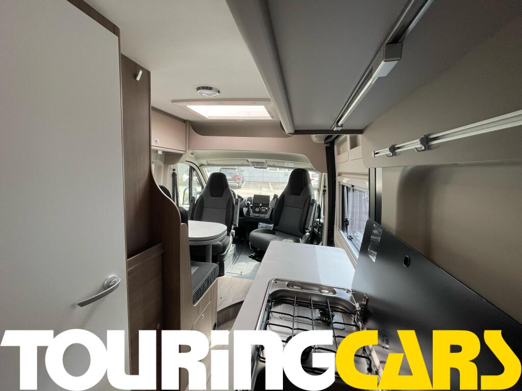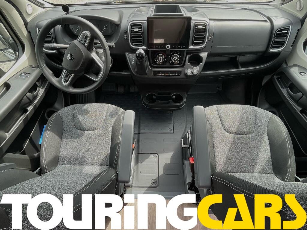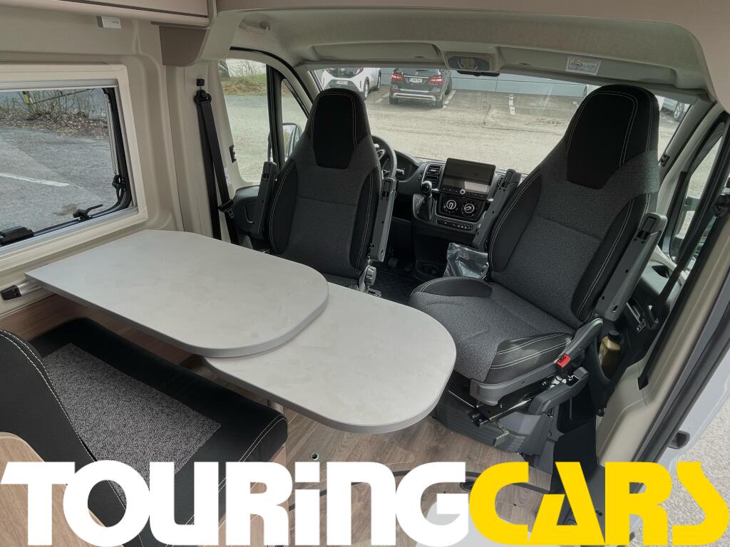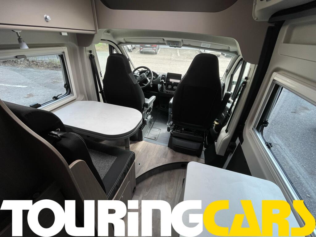 Ohjaamon istuimet verhoiltu asunto-osan kankaalla, kaksi käsinojaa