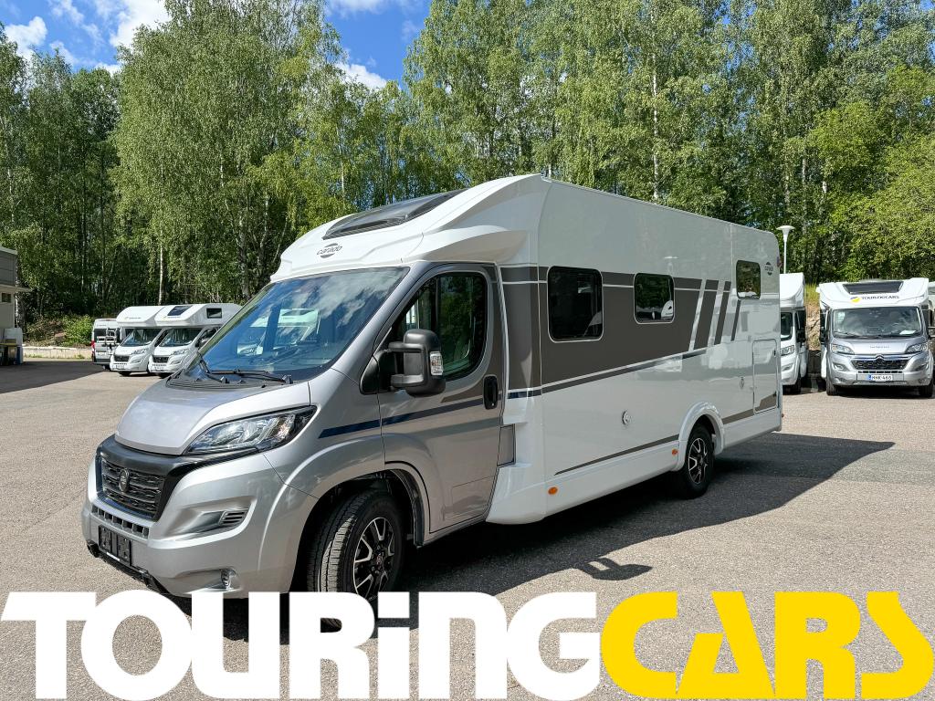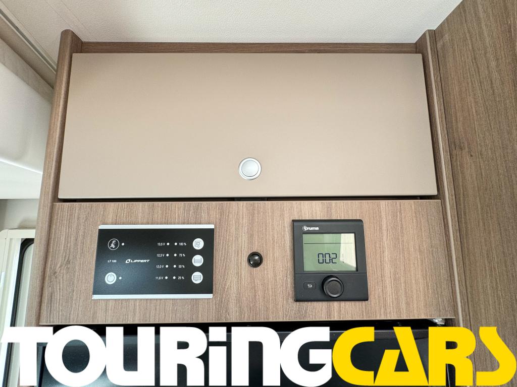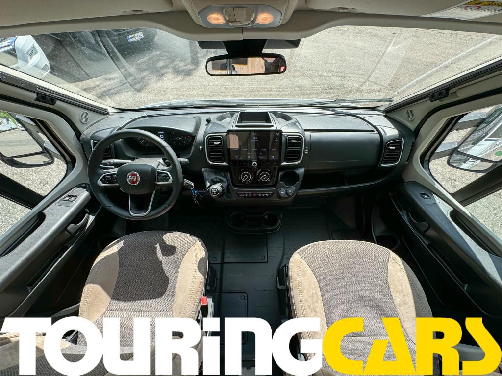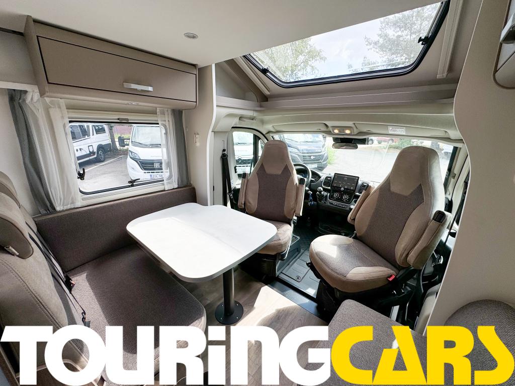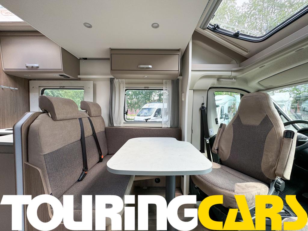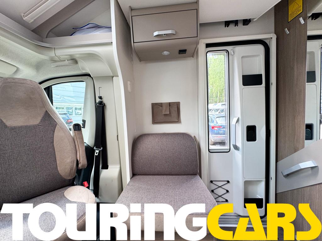 Ohjaamon istuimet verhoiltu asunto-osan kankaalla, kaksi käsinojaa