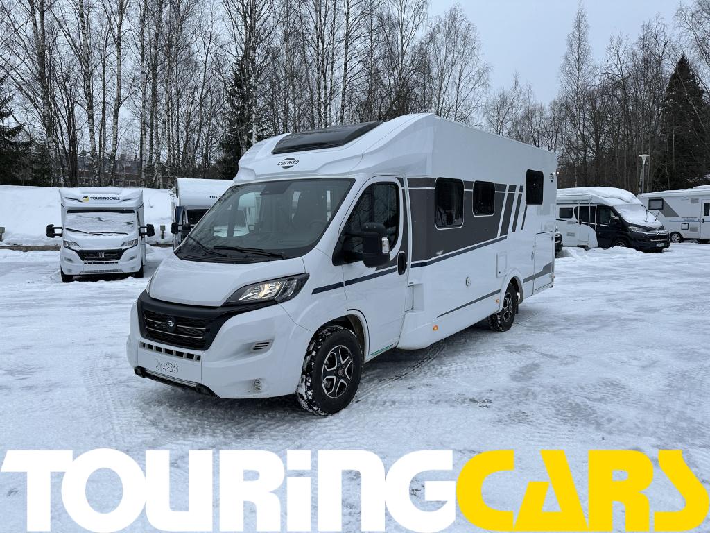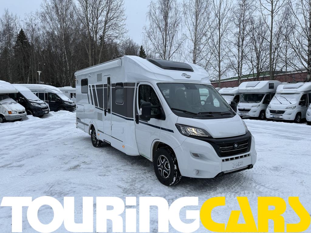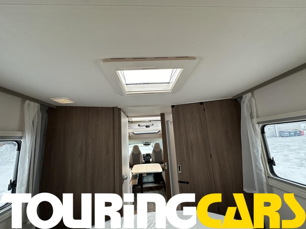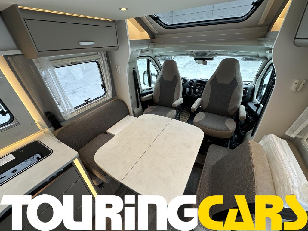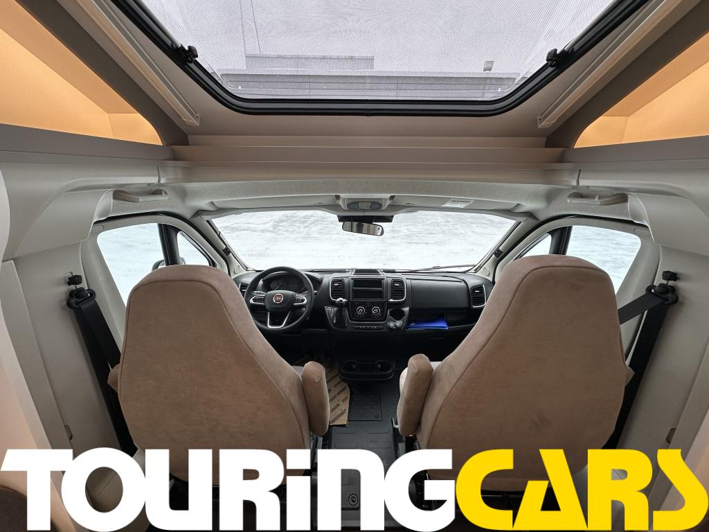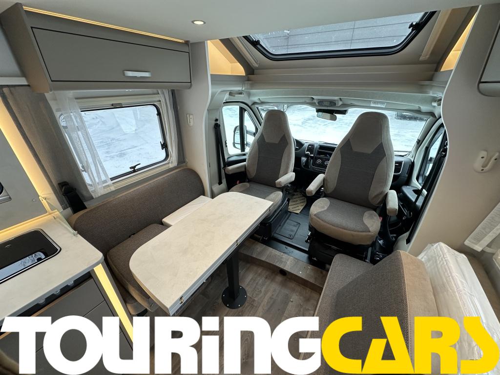 Ohjaamon istuimet verhoiltu asunto-osan kankaalla, kaksi käsinojaa