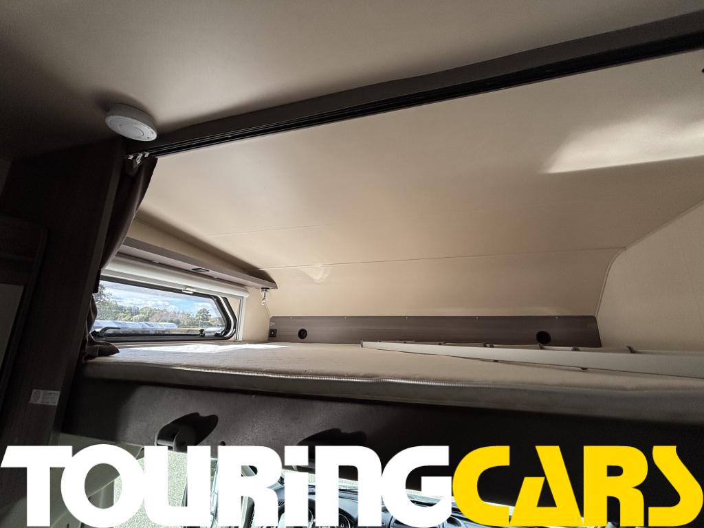 Vakiovarusteinen Dometic-kattoluukku pimennys- ja hyttysverholla takaa raikkaan ilman saannin.