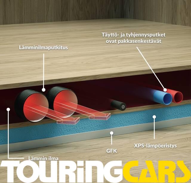 Eristetty ja lämmitettävä takatavaratila jossa tukeva lattiapäällyste Kiinnityskiskot ja -silmukat tavaratilassa