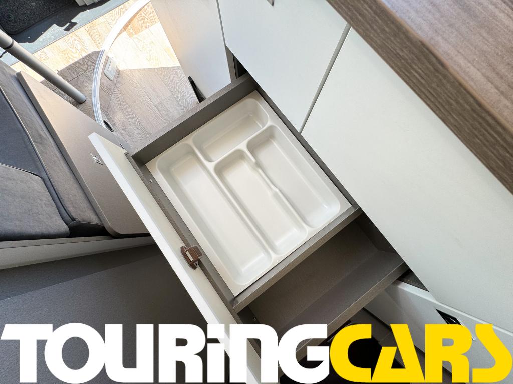 lasikansi, Keittiön pistorasia, Täysin aukeavat tilavat laatikostot, Ruokailuvälinelaatikko